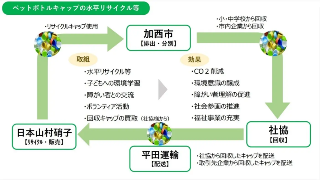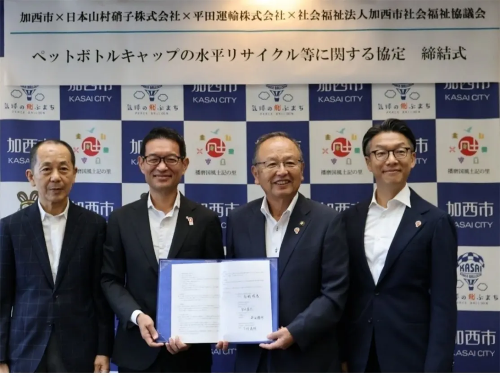 日本⼭村硝⼦株式会社(本社:兵庫県尼崎市、代表取締役 社⻑執行役員:⼭村 昇 以下 当社)は、兵庫県加西市(市⻑:高橋晴彦 以下 加西市)・平田運輸株式会社(本社:兵庫県加西市、代表取締役社⻑:平田優宇 以下 平田運輸)・社会福祉法人加西市社会福祉協議会(所在地:兵庫県加西市、理事⻑:下村義明 以下 加西市社会福祉協議会)の3者と、加西市域において排出される使用済みのペットボトルキャップを、新しいペットボトルのキャップとして再生する「水平リサイクル(Cap to Cap)」の推進を目的とした協定を2025年8月25日(月)に締結しました。