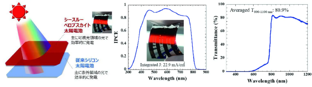 タンデム型は、受光面側から順にペロブスカイト、結晶シリコンそれぞれの発電層を持つ構造となっており、最初にペロブスカイト太陽電池が可視光領域の光エネルギーで発電し、ペロブスカイトが吸収しない赤外領域の光エネルギーで結晶シリコン太陽電池が発電します。そのため、ペロブスカイト太陽電池には、可視光での高い発電能力と赤外線をロスすることなく結晶シリコンに透過させる性能の両立が求められます。今回、両社はペロブスカイト太陽電池の透過性に着目し、赤外線透過率を81%まで向上させることに成功いたしました。