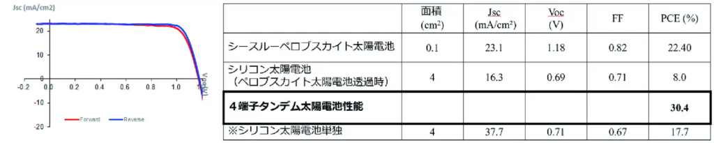 これまでに報告例が無く、両社の極めて優れた技術力を証明することができました。このフィルム型ペロブスカイト太陽電池と結晶シリコン太陽電池を組み合わせることで、タンデム型(4端子)として合計で30.4%という世界最高クラスの変換効率を達成することができました。
