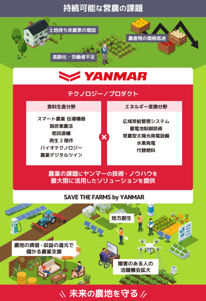 2025年6月、ヤンマーホールディングスが発表したプロジェクト「SAVE THE FARMS by YANMAR」は、単なる農業の効率化や収穫サイクルの短縮を目指すものではない。食×再生可能エネルギー×環境再生×農福連携という4つの要素を統合し、地域が直面する構造的課題に包括的にアプローチする挑戦的な取り組みだ。