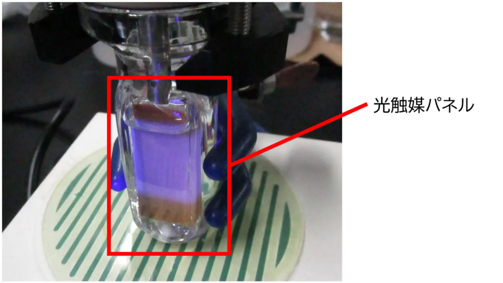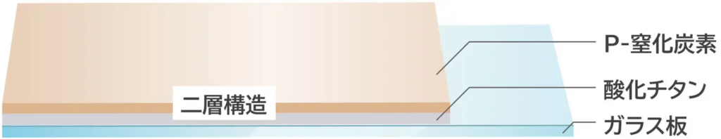 ・ホウケイ酸ガラス平板上に光触媒を固定化するため、金属酸化物(酸化チタン)層を生成し、その上に可視光を吸収する有機半導体である窒化炭素の層を重ねる二層構造を採用。これを固定化することで、人工光触媒のパネル化を実現