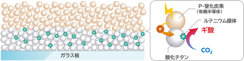 本開発では、ガラス平板上に酸化チタン層を堆積させ、その上に有機半導体である窒化炭素を載せて固定化することに成功しました。これによりパネル状にした光触媒にCO2の還元活性点となるルテニウム錯体(以下、RuP)(※3)を吸着させ、可視光を当てることで、CO2を原料としてギ酸が生成されることを確認しました。