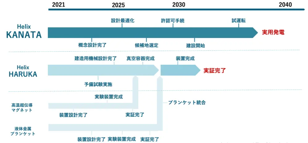 ヘリカル型核融合炉は、これまでの国立大学や国立研究機関における70年にわたる研究開発の結果、商用発電所に最も適した性質(※3)を備えた方式であることが示されてきました。Helical Fusionは、その知見を継承する世界で唯一の企業として、ヘリカル型核融合炉による商用発電所を実用化する計画「Helix Program」を進めています。Helix Programでは、2020年代中をめどに二大開発要素「高温超伝導マグネット」「ブランケット兼ダイバータ」の個別実証を完了し、2030年代中には、最終実証装置「Helix HARUKA」による統合実証、および発電初号機「Helix KANATA」による世界初の実用発電を達成する計画です。