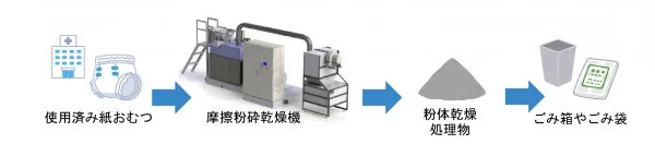 使用済み紙おむつを粉砕し、その際に発生する摩擦熱で乾燥させる摩擦粉砕乾燥機の安定性・操作性を向上させるとともに、使用済み紙おむつ由来の臭いを消臭する技術※の有効性を確認します。