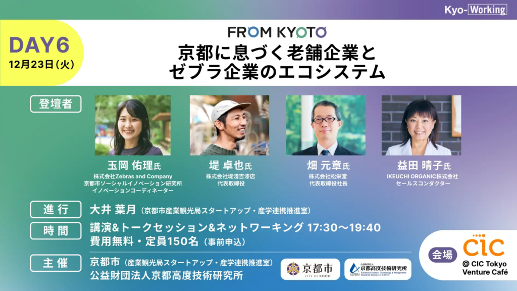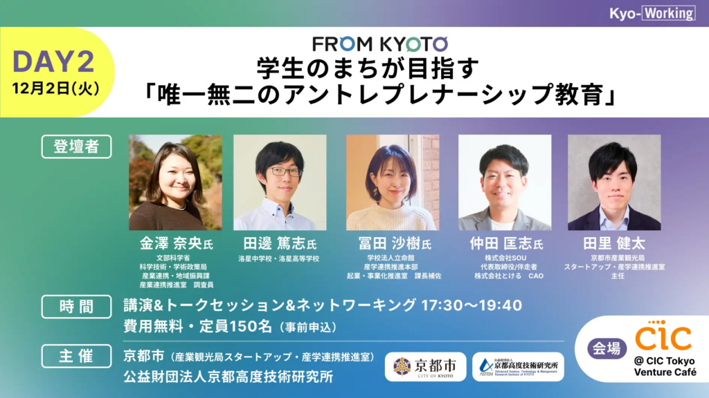 京都市及び(公財)京都高度技術研究所では、スタートアップにおける新たな潮流の創出、スタートアップ・エコシステムの充実を目的に、「アントレプレナーシップ教育」「カルチャープレナー」「ゼブラ企業」など、京都が誇る先駆的なテーマによるカンファレンス&ネットワーキングイベント『FROM KYOTO(フロムキョウト)』を開催します。