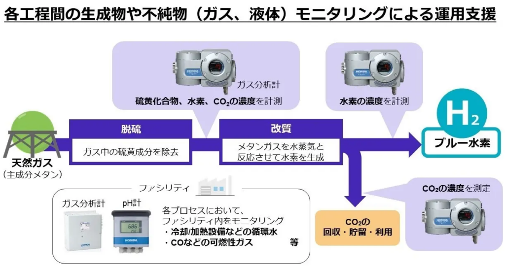 天然ガスを用いた水素製造においては、水素をはじめとする生成物やCO2、硫黄成分など、天然ガスに含まれる不純物の濃度を正確にモニタリングすることが不可欠です。当社は、ブルー水素製造プロセスに最適なガスおよび液体の分析・計測機器の選定(他社製品を含む)から納入、運用支援までを一貫して担っています。また、分析・計測に干渉を与える不要なガスや水分の除去といった前処理を含めた総合的なソリューションを提供し、正確かつ安定したモニタリングを実現します。高度なノウハウが求められるこれらの作業を当社が一貫して対応することで、プロジェクト全体の運用効率向上に貢献します。