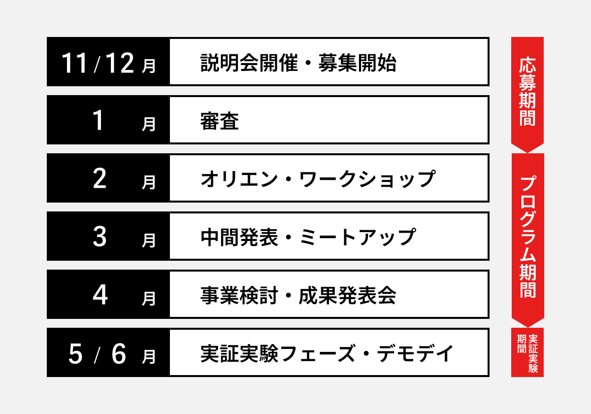 プログラムは11月19日の報道関係者向け発表会とプレスリリースを皮切りに始動。年明けまでを応募期間とし、幅広い分野からアイデアを募集する。1月末までに3社とメンターが協議し採択企業を決定。選ばれたチームは2~4月にアイデアを磨き、5~6月にアリーナや地域を舞台に実証を実施。夏には成果発表のデモデイを予定している。