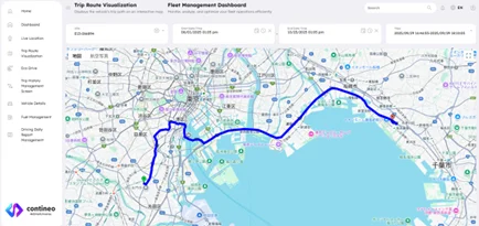取得した車両データは、IoTローコードノーコードプラットフォーム「Contineo(コンティネオ)」上で開発したシステムにより車両情報や走行履歴をリアルタイムに可視化し、車両管理者が利用するシステムとしての実用性についても検証しました。本取組みにより、フリート管理の効率化とスケーラビリティの向上を両立する、新しい車両管理システムの有効性を実証することができました。