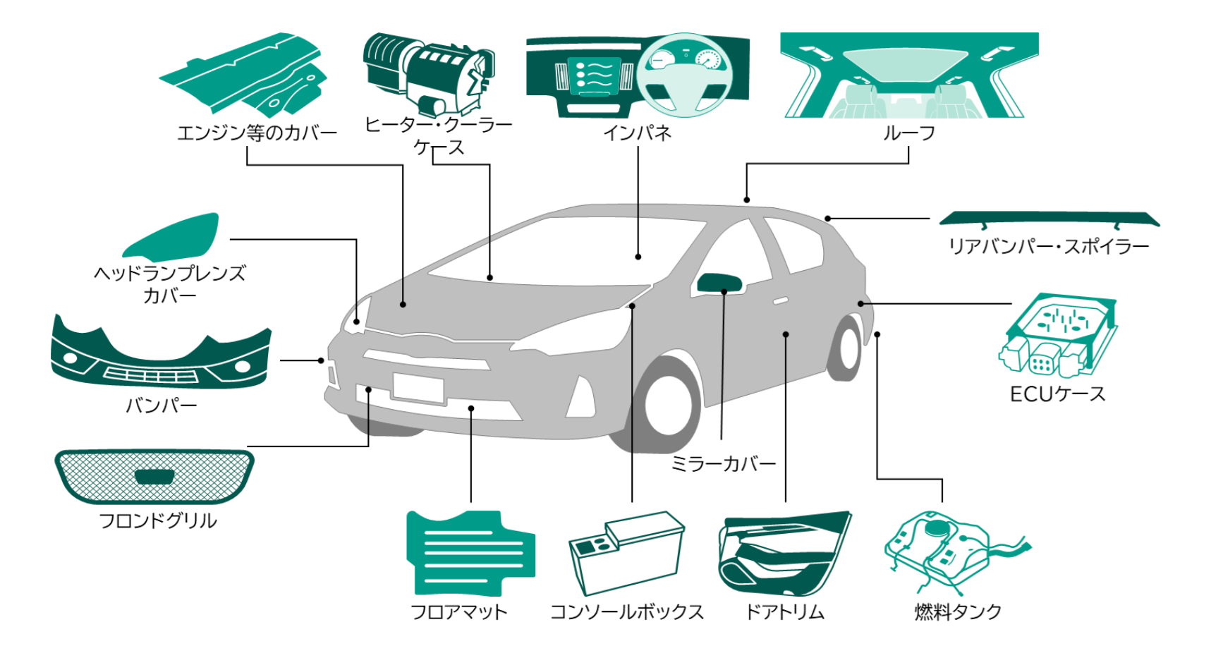 燃費改善やEV化の流れの中で、自動車の軽量化は重要なテーマとなっている。こうした背景から、自動車1台あたりに使用されるプラスチックの割合は、年々高まっている。