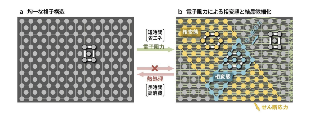 手法の核心は「高密度パルス電流(HDPEC)処理」だ。二相チタン合金にパルス電流を瞬時に流すことで、非平衡な原子拡散と相変態を誘発し、結晶組織の微細化および多相化を実現する。その結果、材料の靭性を最大30%向上させることに成功した。従来の熱処理が時間をかけて熱を介して原子を動かすのに対し、本手法はパルス電流中を流れる電子が原子を直接押し動かす「電子風力(非熱的効果)」を活用する点が特徴だ。